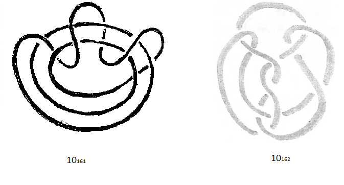 So the knot numbered 10162 in the picture above was actually Rolfsen’s original 10163, and thus not equivalent to 10161! For the avoidance of doubt, here is the real Perko pair, with drawings provided by the man himself. Accept no imitations!